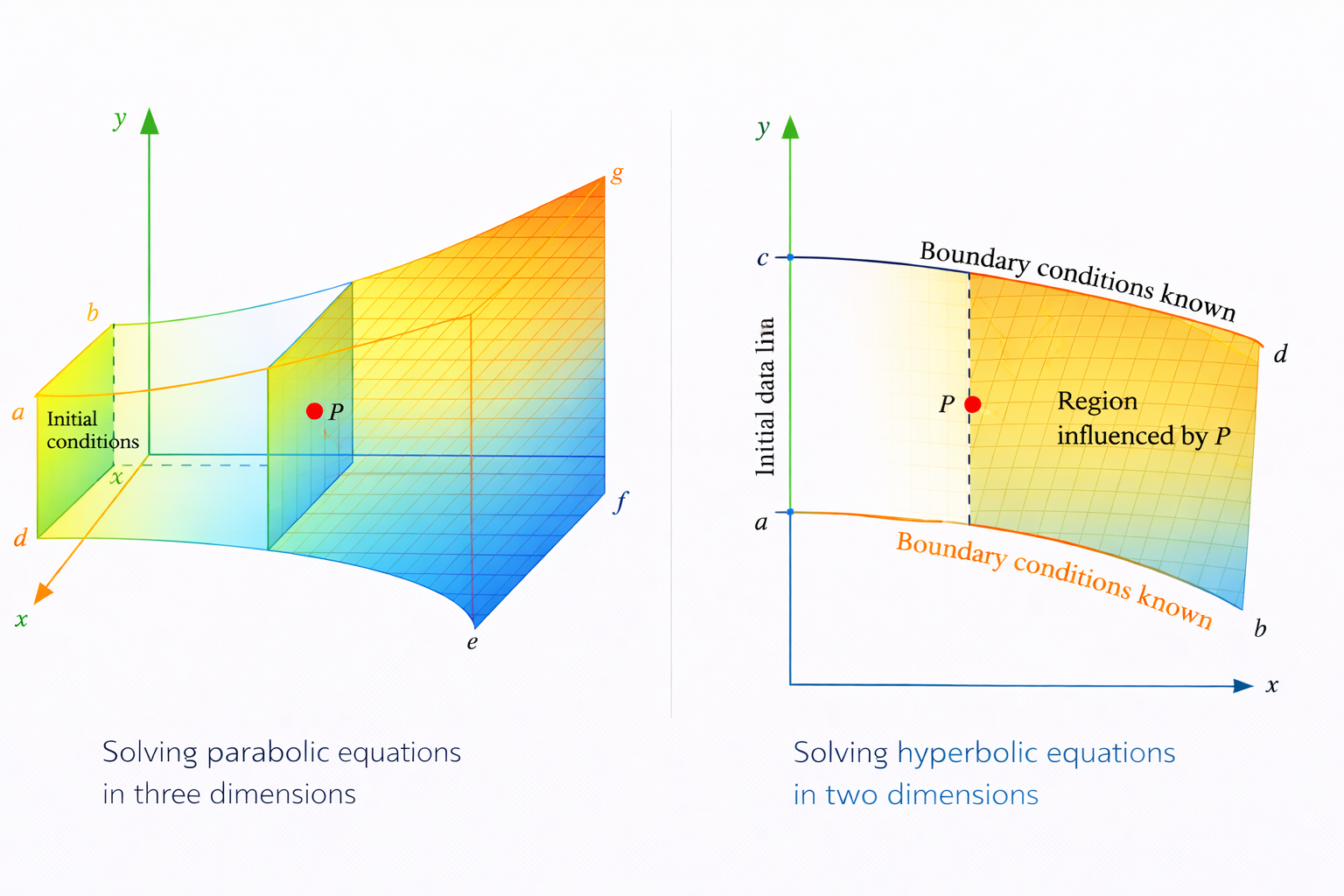 | 双曲型 | 有两组实特征方向 | 波动方程、Euler方程 | 扰动沿特征线以有限速度传播,解与初始条件关系密切 |