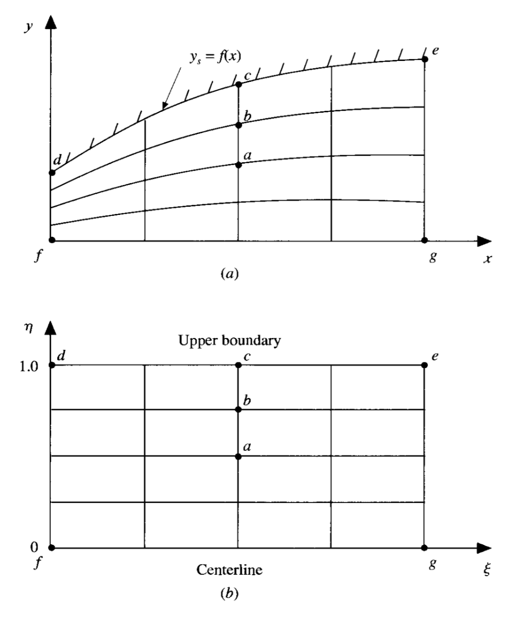 \[ \frac{\partial \eta}{\partial t}=\frac{1}{J}\left[\left(\frac{\partial x}{\partial t}\right)\left(\frac{\partial y}{\partial \xi}\right)-\left(\frac{\partial y}{\partial t}\right)\left(\frac{\partial x}{\partial \xi}\right)\right] \]